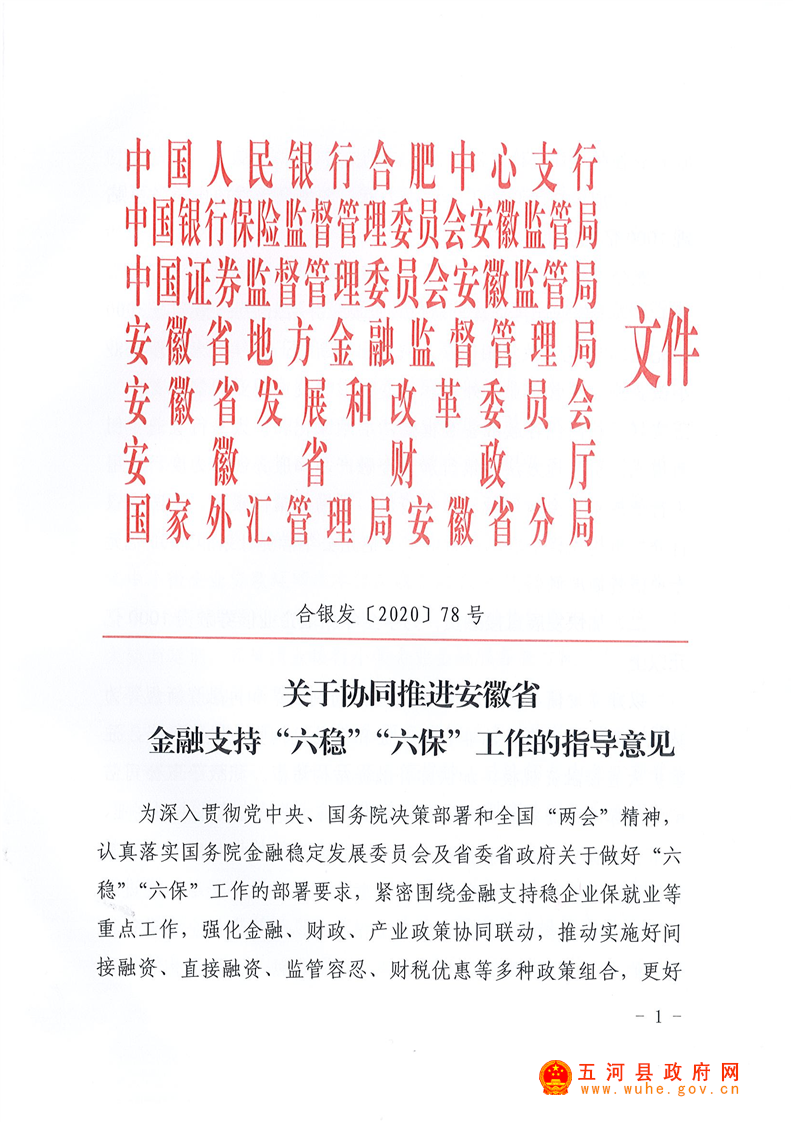 关于协同推进安徽省金融支持“六稳”“六保”工作的指导意见